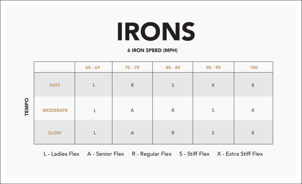 Di seguito, ecco una tabella sulla velocità con ferri e legni, dalla quale evincere se il nostro swing è lento, moderato o veloce, e di conseguenza optare per Lady, Senior, Regular, Stiff o Extra Stiff.