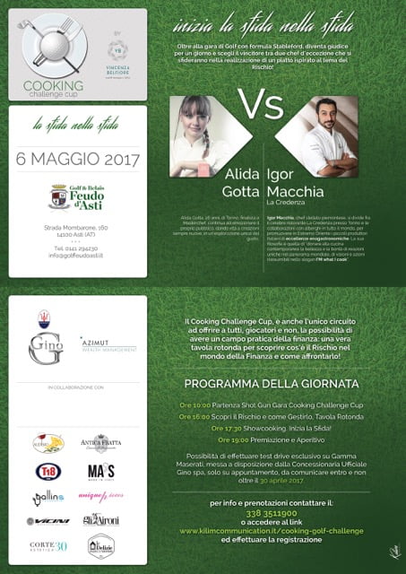 La formula della Cooking Challenge Cup prevede delle regolari gare stableford, al termine delle quali ci sarà un’ulteriore sfida, ma di alta cucina: in ogni tappa sarà presente un rinomato chef piemontese, che sfiderà in uno showcooking aperto al pubblico Alida Gotta, la giovane finalista di Masterchef 5.