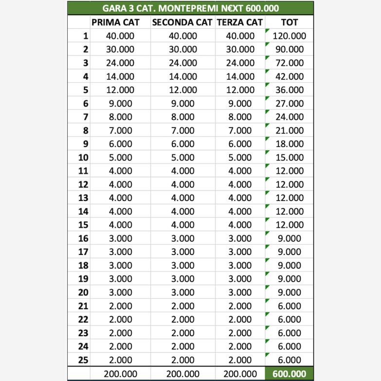 Ecco qui sotto alcune tabelle di esempio di montepremi per gare con tre categorie.
