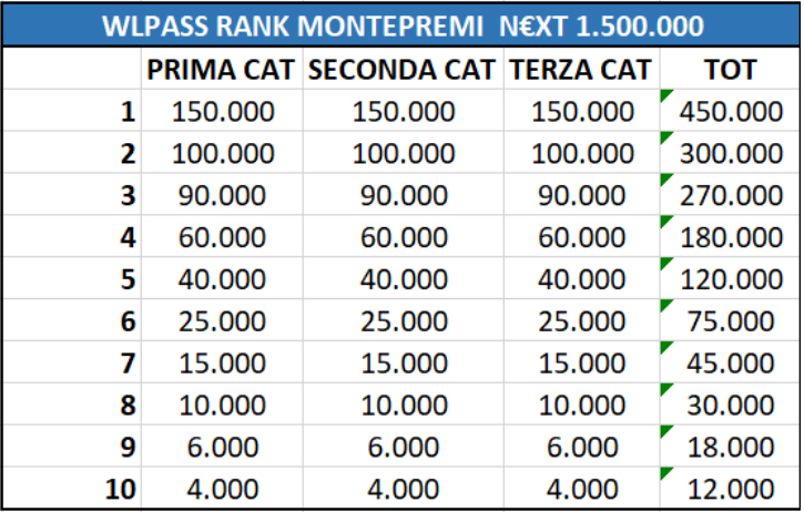 Ecco la tabella montepremi WLPASS ranking, davvero sostanziosa (150.000=750 euro).